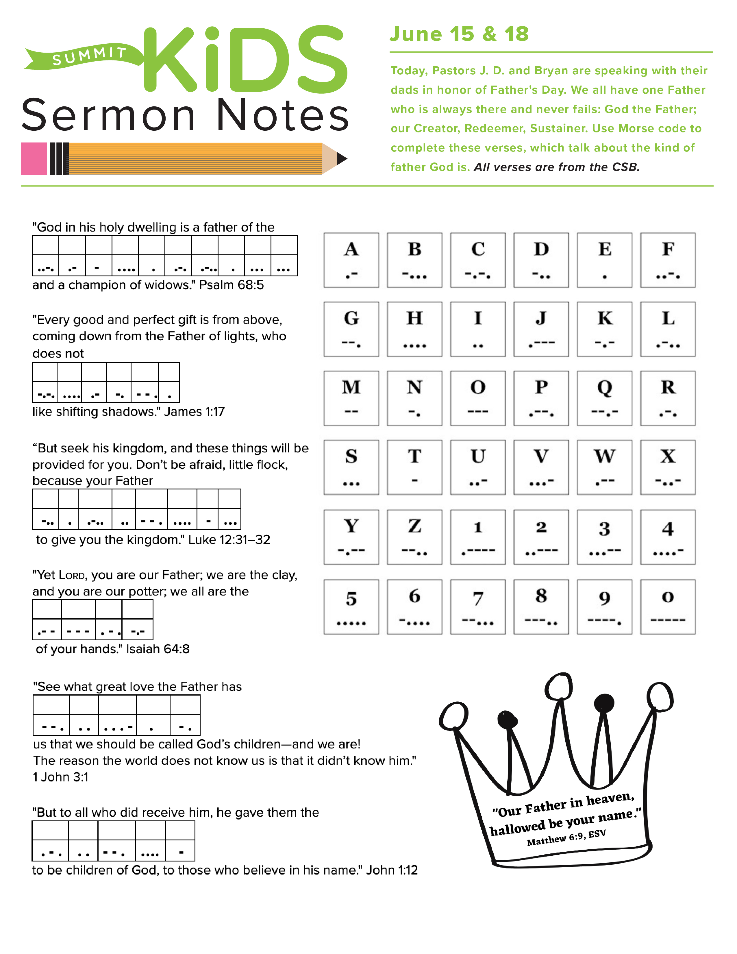 为庆祝父亲节,J.D.和Bryan牧师主持了他们自己父亲的小组讨论。作为经历过做父亲的起伏的男人,林恩-格里尔和克劳福德-洛里茨提供实用的、符合圣经的智慧来鼓励男人--无论他们是否是父亲。