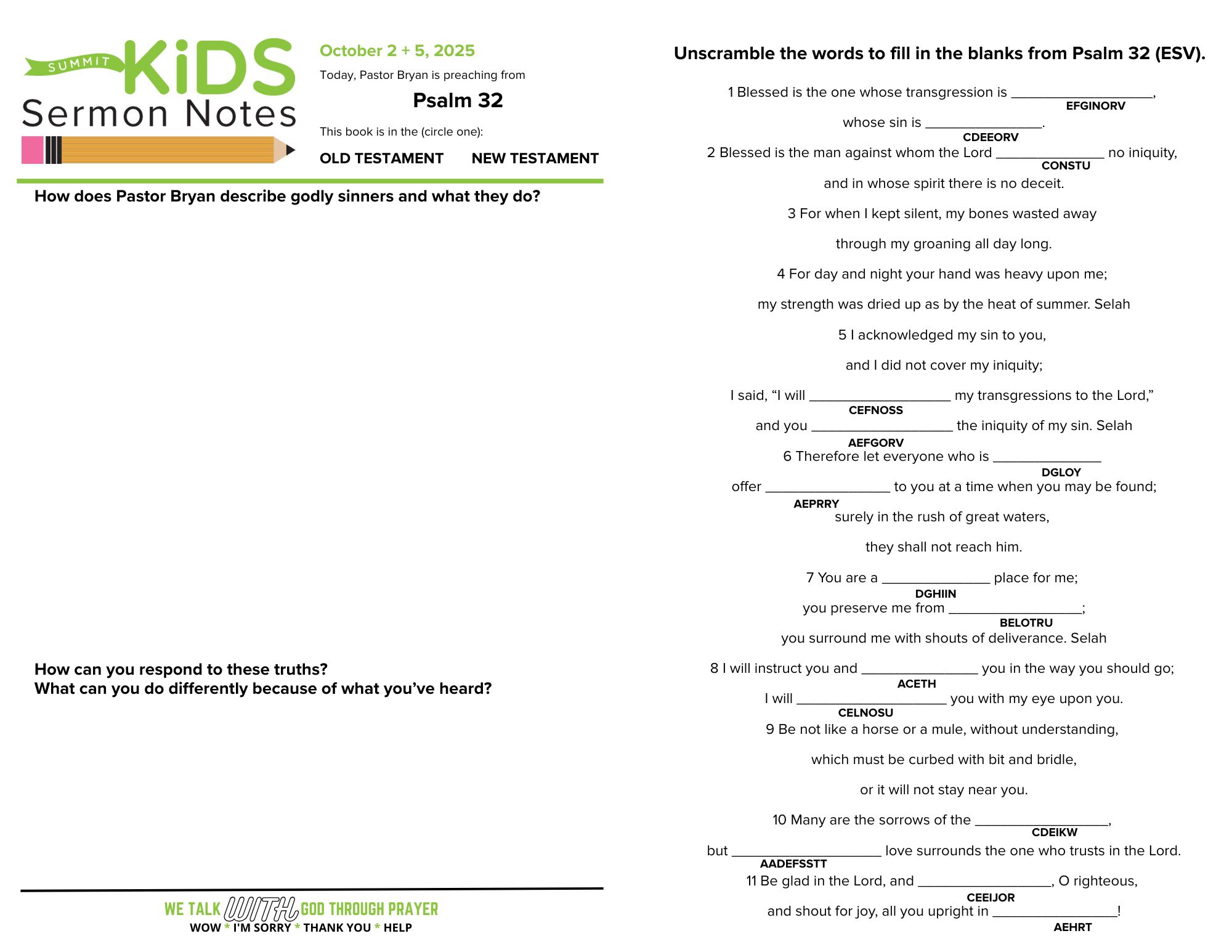 众所周知,《诗篇》第 51 篇是大卫承认自己与拔示巴及其丈夫有关的罪的诗篇。但在本周的信息中,布莱恩牧师将带领我们学习《诗篇》第 32 篇,揭示大卫在真正认罪前一年的内心世界。我们有时也会像大卫一样,在认罪时显得迟缓,误以为在这些时刻我们应该与神保持安全的距离。然而,事实是,上帝对我们来说是一个安全的地方,正是因为我们的罪已被耶稣的宝血所遮盖。