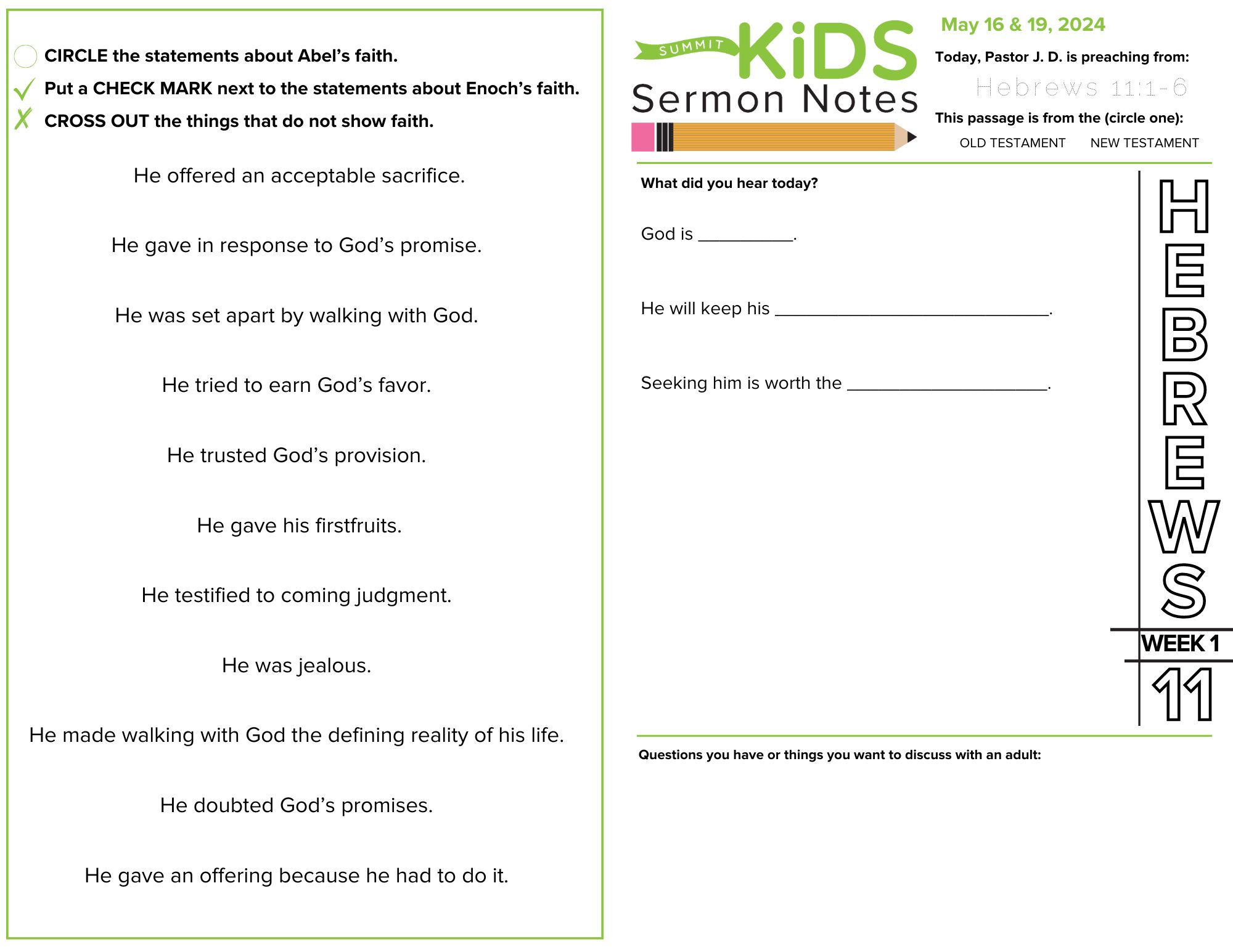 希伯来书》第 11 章是《圣经》中最鼓舞人心的章节之一,通常被称为 "信心的大殿"。但是,虽然其中的故事确实很有力量,但我们不应该把故事中的人视为完美无缺,也不应该把他们的信仰视为高不可攀。在本周的信息中,J.D.牧师通过希伯来书第 11 章开始了我们的系列讲座,帮助我们看到信心在实践中的样子。通过亚伯和以诺的例子,我们认识到,当我们相信神的应许并付诸行动时,才是真正的信心--即使周围的人不相信。